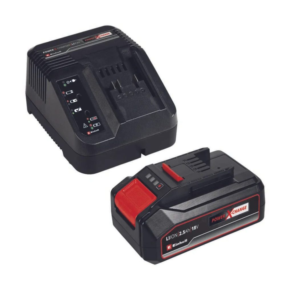 El Starter Kit Einhell 18V 2.5Ah PXC es la base ideal para comenzar o expandir la gama Power X-Change en su hogar. El Starter Kit con una batería recargable Power X-Change PLUS de 18 V y 2,5 Ah y un cargador de batería de alta velocidad es un miembro del sistema de batería recargable Power X-Change multifuncional y completamente intercambiable de Einhell. Las baterías recargables Power X-Change se pueden utilizar universalmente para suministrar energía y resistencia a todas las herramientas inalámbricas de toda la familia de productos de jardín y taller. Los cargadores de la serie también se pueden utilizar universalmente para cada batería recargable PXC. Las ventajas para el cliente son obvias: una sola batería recargable y un solo cargador para todas las herramientas no solo ahorra importantes costos de compra, El uso universal también ayuda a proteger el medio ambiente y proporciona flexibilidad en el hogar y el jardín también. También elimina el desorden y el caos de tener diferentes baterías recargables y cargadores para cada herramienta por separado. La batería recargable de alta calidad resiste el efecto memoria y la autodescarga normalmente asociada con las baterías, para brindar una alta potencia constante. La Power X-Change de 18 V y 2,5 Ah es la batería recargable básica ideal de la familia Power X-Change y también es adecuada para el uso de TWIN-PACK para aplicaciones de 36 V. El sistema de gestión de batería activo controlado por proceso ABS tiene un microprocesador para monitorear permanentemente los parámetros de la batería. Por lo tanto, garantiza la máxima seguridad, un rendimiento óptimo de la herramienta, un tiempo de funcionamiento máximo y una vida útil máxima. El nivel de carga actual se puede verificar en una pantalla LED de 3 pasos. La carcasa está diseñada para ser resistente al polvo, la corrosión y las influencias mecánicas. Hay un asa de bandeja para permitir que la batería se retire de cada herramienta con facilidad. El cargador de batería de alta velocidad tiene un diseño compacto y, por lo tanto, ocupa poco espacio, y tiene ojales de suspensión integrados para colgarlo fácilmente en la pared. La tecnología de carga de alta velocidad significa tiempos de carga cortos, y para una carga óptima y máxima seguridad, la batería es monitoreada permanentemente por un sistema de gestión de carga inteligente. Hay un modo de actualización para reactivar las baterías que se han descargado exhaustivamente. El indicador LED de nivel de carga de 6 etapas proporciona toda la información actualizada. Hay un asa de bandeja para permitir que la batería se retire de cada herramienta con facilidad. El cargador de batería de alta velocidad tiene un diseño compacto y, por lo tanto, ocupa poco espacio, y tiene ojales de suspensión integrados para colgarlo fácilmente en la pared. La tecnología de carga de alta velocidad significa tiempos de carga cortos, y para una carga óptima y máxima seguridad, la batería es monitoreada permanentemente por un sistema de gestión de carga inteligente. Hay un modo de actualización para reactivar las baterías que se han descargado exhaustivamente. El indicador LED de nivel de carga de 6 etapas proporciona toda la información actualizada. Hay un asa de bandeja para permitir que la batería se retire de cada herramienta con facilidad. El cargador de batería de alta velocidad tiene un diseño compacto y, por lo tanto, ocupa poco espacio, y tiene ojales de suspensión integrados para colgarlo fácilmente en la pared. La tecnología de carga de alta velocidad significa tiempos de carga cortos, y para una carga óptima y máxima seguridad, la batería es monitoreada permanentemente por un sistema de gestión de carga inteligente. Hay un modo de actualización para reactivar las baterías que se han descargado exhaustivamente. El indicador LED de nivel de carga de 6 etapas proporciona toda la información actualizada. La tecnología de carga de alta velocidad significa tiempos de carga cortos, y para una carga óptima y máxima seguridad, la batería es monitoreada permanentemente por un sistema de gestión de carga inteligente. Hay un modo de actualización para reactivar las baterías que se han descargado exhaustivamente. El indicador LED de nivel de carga de 6 etapas proporciona toda la información actualizada. La tecnología de carga de alta velocidad significa tiempos de carga cortos, y para una carga óptima y máxima seguridad, la batería es monitoreada permanentemente por un sistema de gestión de carga inteligente. Hay un modo de actualización para reactivar las baterías que se han descargado exhaustivamente. El indicador LED de nivel de carga de 6 etapas proporciona toda la información actualizada.